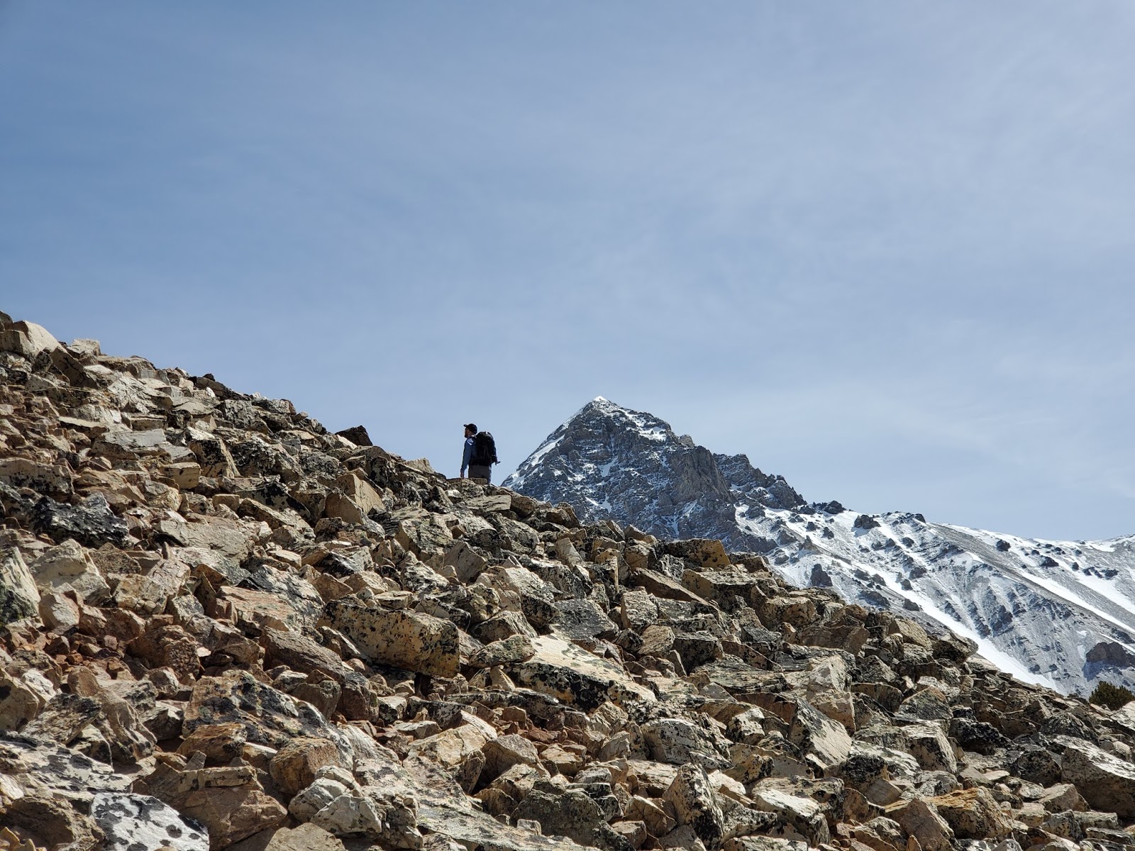 That worked quite well and we soon arrived at a nice bench, had a short rest and then began another push to the tree line. At this point we were at 10k and after more brief conversation Malachai had decided he was at his high point for the day. We made sure Chai was good-to-go and decided that we would split up (slight wince) and would regroup in about 2 hours. From there I could see that the ridge we wanted was not far and decided to keep the line we were on, aiming for the Col just northeast of point 11,045. Todd worked the snow and I stuck to the rocks. That overhanging cornice turned out to be a decent size and I was glad we were never under it. We arrived at the Col, had a short break then set off for the summit, skirting the rise in the ridge to the north to about 11,400.